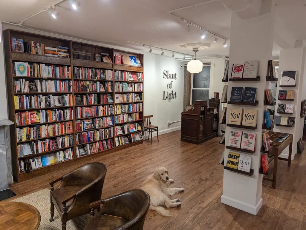 Slant of Light Books feels like walking into someone’s living room. Between the cozy fireplace, cluster of armchairs in the center, and the open walls lined with tall shelves overflowing with new and used books, it has so much character.