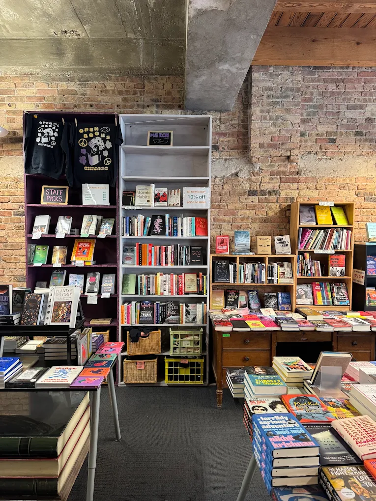A strictly employee-owned shop, Pilsen Community Books is a store where many of the books focus on left-leaning topics. The stock here is spread out in a spacious setting with pendant lighting and tables laid out with specific texts on them.