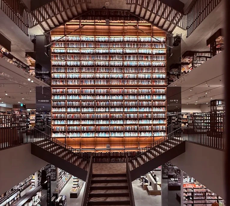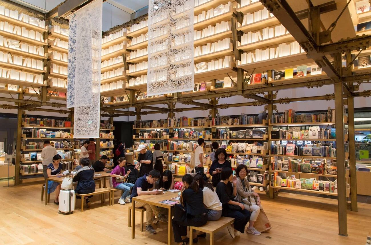 Situated in Nagoya, Tsutaya Bookstore stands out for its brightly lit shelving that climbs upward into reflective panels, creating a striking visual effect. Located inside AEON Mall Nagoya, it spans two floors and offers a wide array of literature, including comics, magazines, and books on a range of topics. There’s also an attached café where you can settle in with your new purchases.