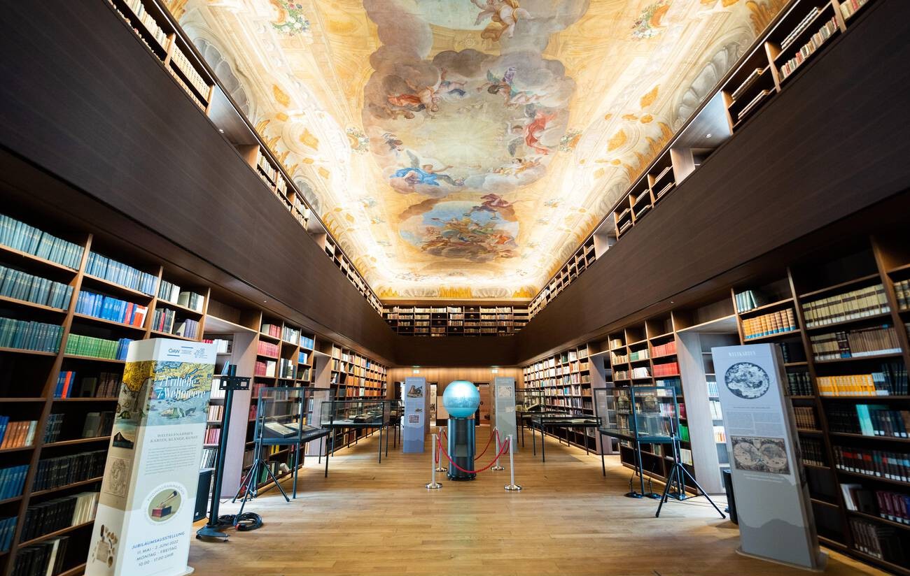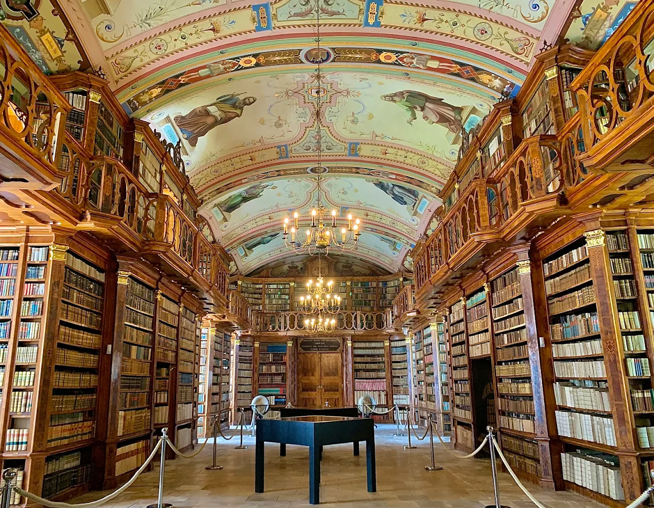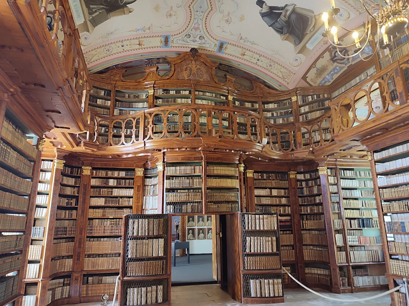Few libraries leave such an immediate impression as the Seitenstetten Abbey Library. The moment you step into the rectangular hall, it takes you by surprise with its wooden balcony gallery, vaulted ceilings, and exhibition displays.