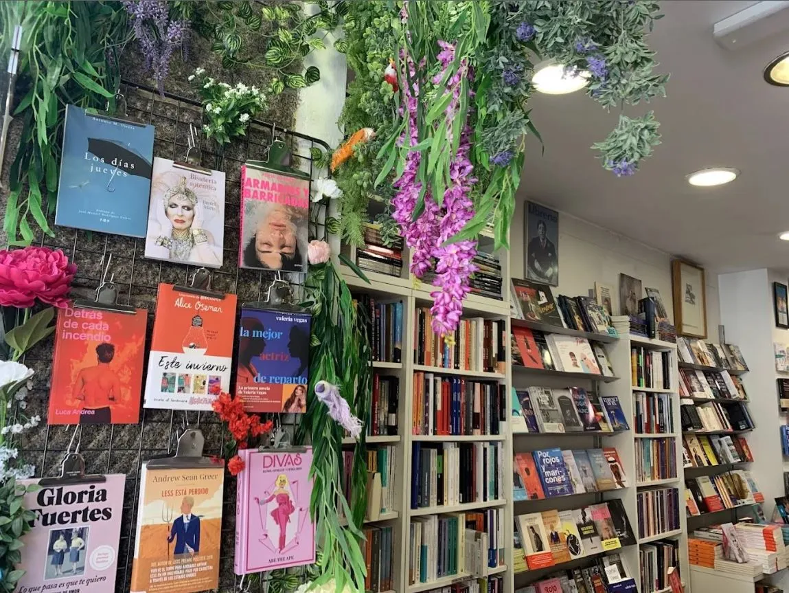 You’ll easily be able to spot Berkana as you stroll down C/ de Hortaleza; just look out for the bright pink facade. When you enter the narrow, hallway-style space, you’ll see books lining both walls, with some even hanging on a fence surrounded by green leaves.