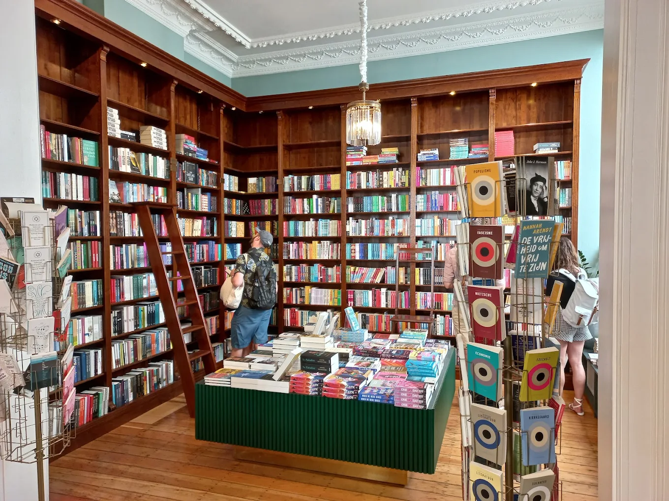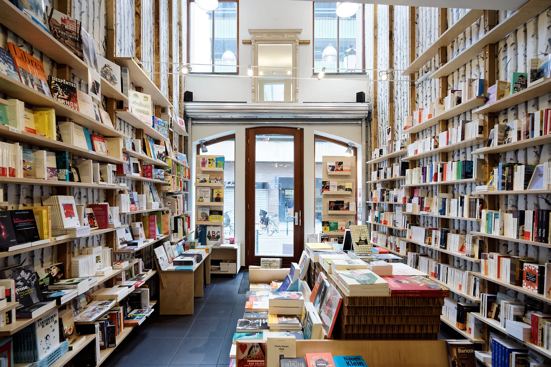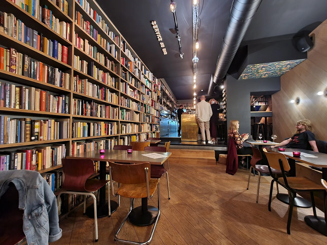 Alongside the store’s curated selection of English and Dutch fiction, nonfiction, art, and various merchandise, its bar keeps up a steady supply of wines, coffee, snacks, and cake. Overall, it has a serene atmosphere; a quiet retreat where you can disconnect from the chaos of daily life and immerse yourself in a book club, salon, or just a nice beverage.