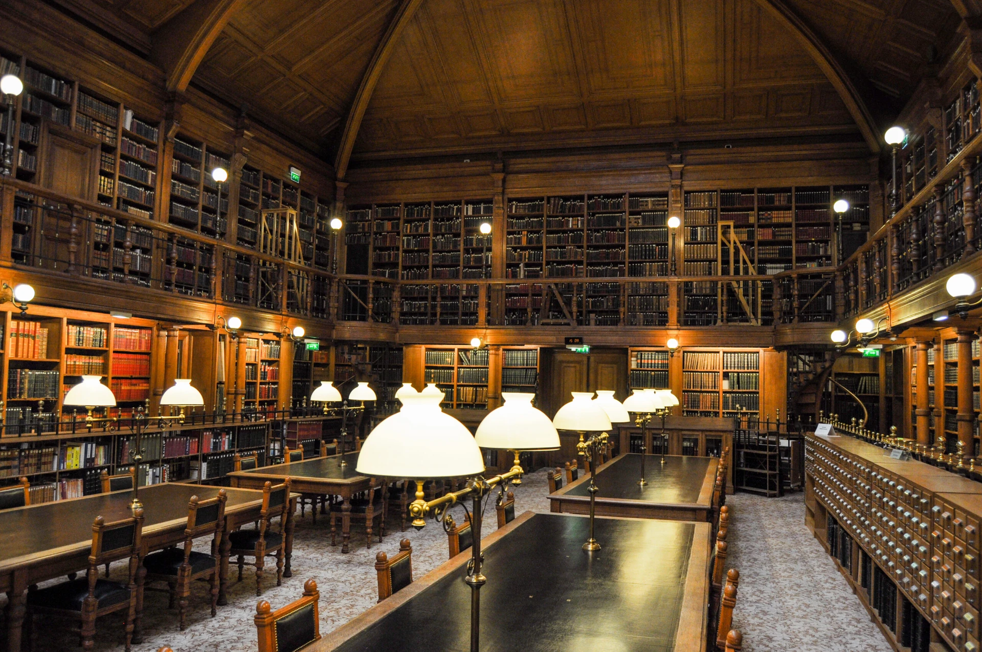 Located within Paris’s City Hall, the Bibliothèque de l’Hôtel de Ville in Paris harkens from the late 19th century with warm oak paneling and a high, barrel-vaulted ceiling dotted with mosaic skylights.