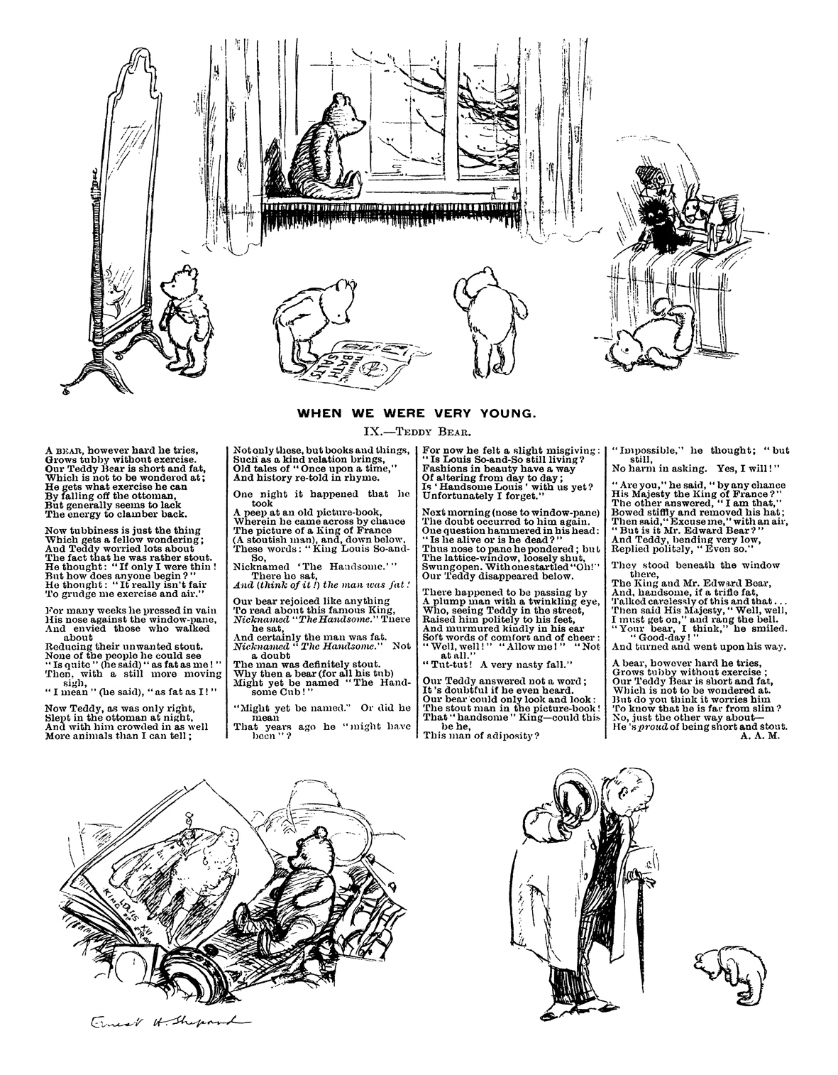 Although not yet named, Winnie-the-Pooh first appeared in A.A. Milne’s poem “Teddy Bear” (Poem IX in When We Were Very Young), which was originally published in Punch magazine in 1924.