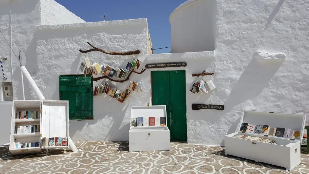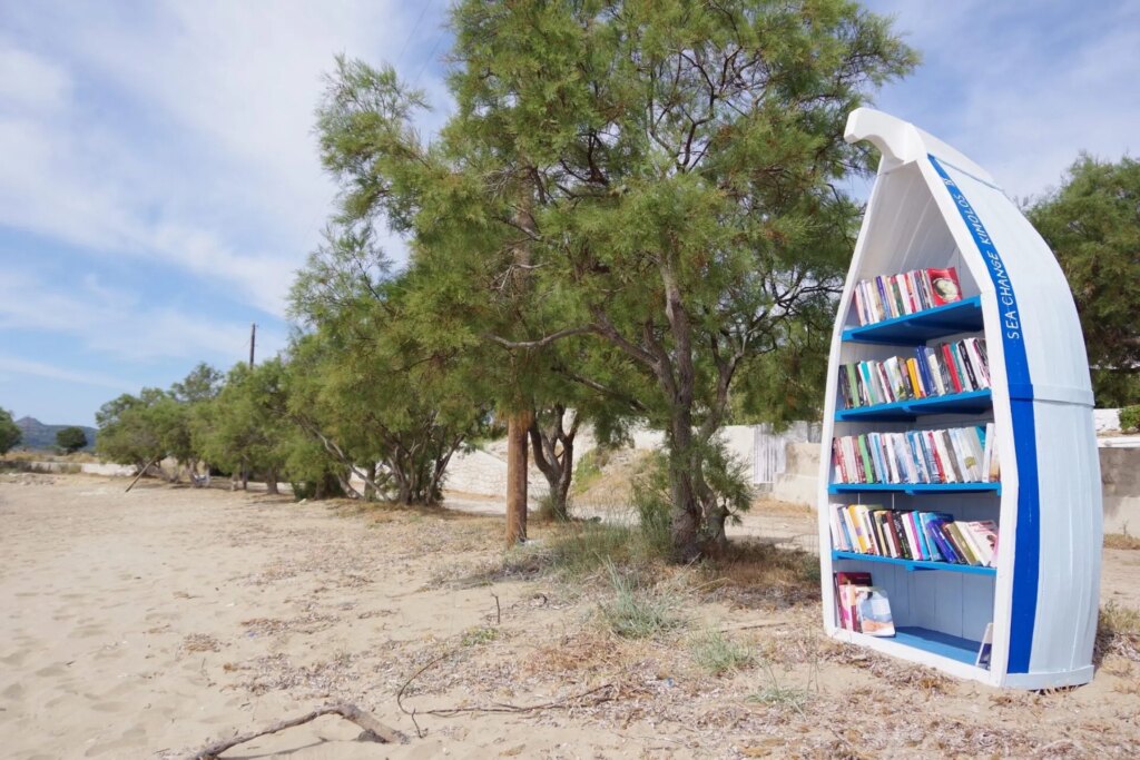 On the island of Kimolos, you can find four unique, open-air libraries known as the Kimolos Open Lending Libraries. These free-standing bookshelves are placed near different beaches and filled with secondhand books for visitors to borrow freely. Each is a different repurposed, hand-painted boat with a simple environmental message.