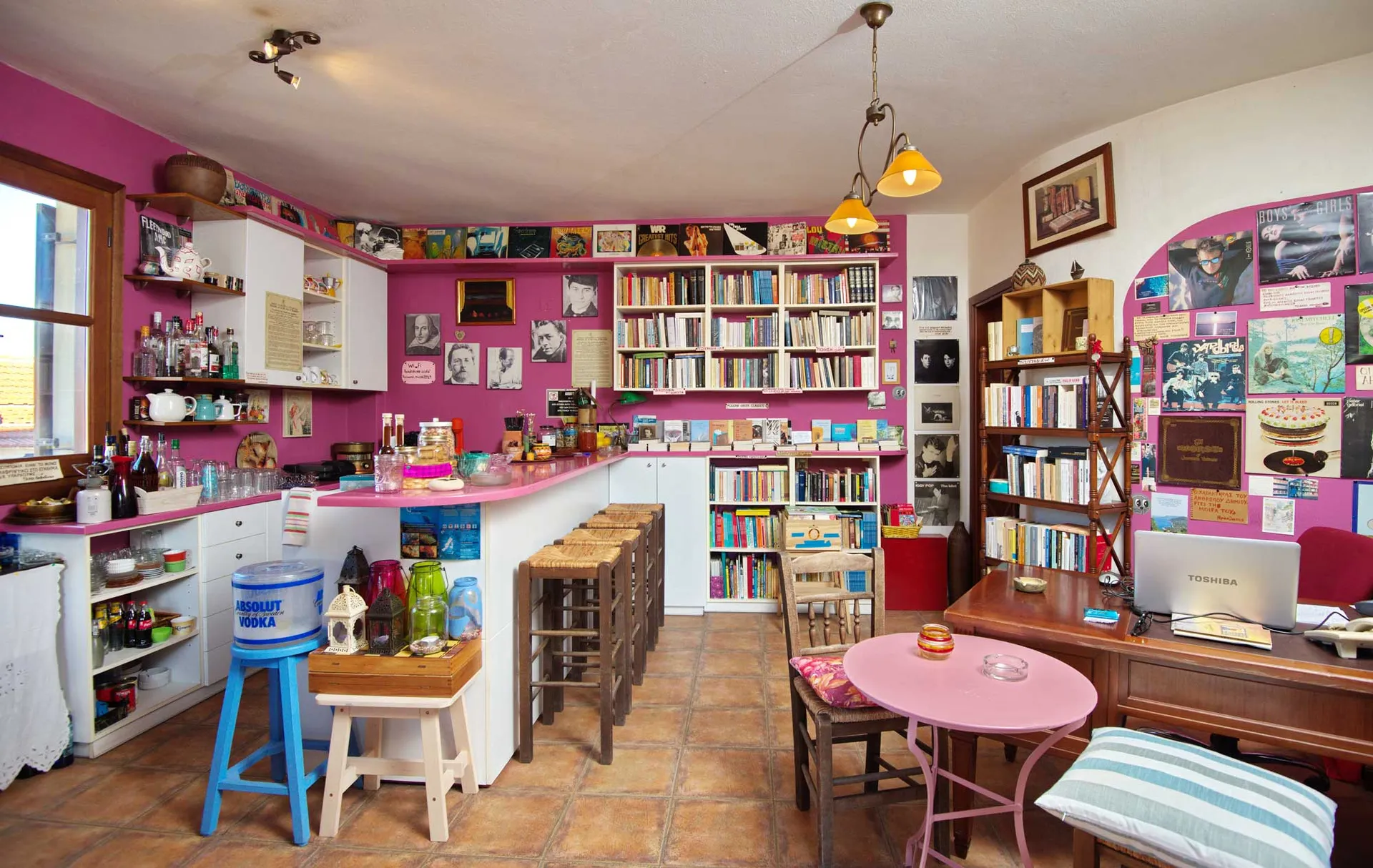 Jumping over to Patmos, Koukoumavla is a bookstore and art gift shop with a lot of flavor. It catches the eye with its vibrantly colored walls and checkered floors, displaying an abundance of paintings and decor that make the interior pop.