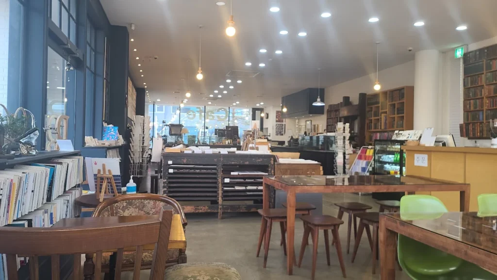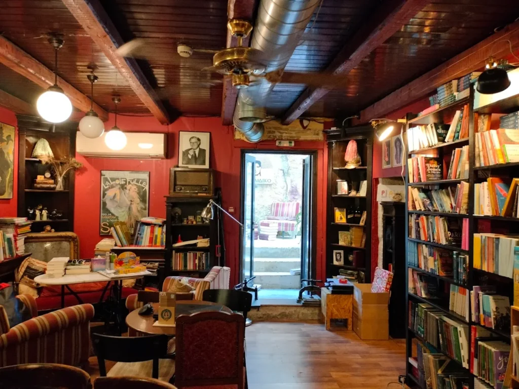 Plous Books & Coffee is a vintage book café with wine-red walls and warm lighting, decorated with retro furniture and posters that give the place a distinct style. It keeps a curated selection of Greek literature and pieces translated into different languages (notably Italian and English).