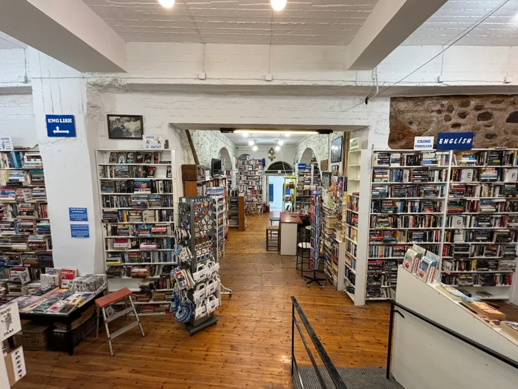 To get to the next destination, you’ll have to return to Athens and board a bus to Volos, where you can find a ferry to Alonnisos. There, you’ll find an idyllic book café called Atrapos. The bookstore side has a nice selection of titles, both new and secondhand, mainly in Greek with some translated works in English and a few other languages.