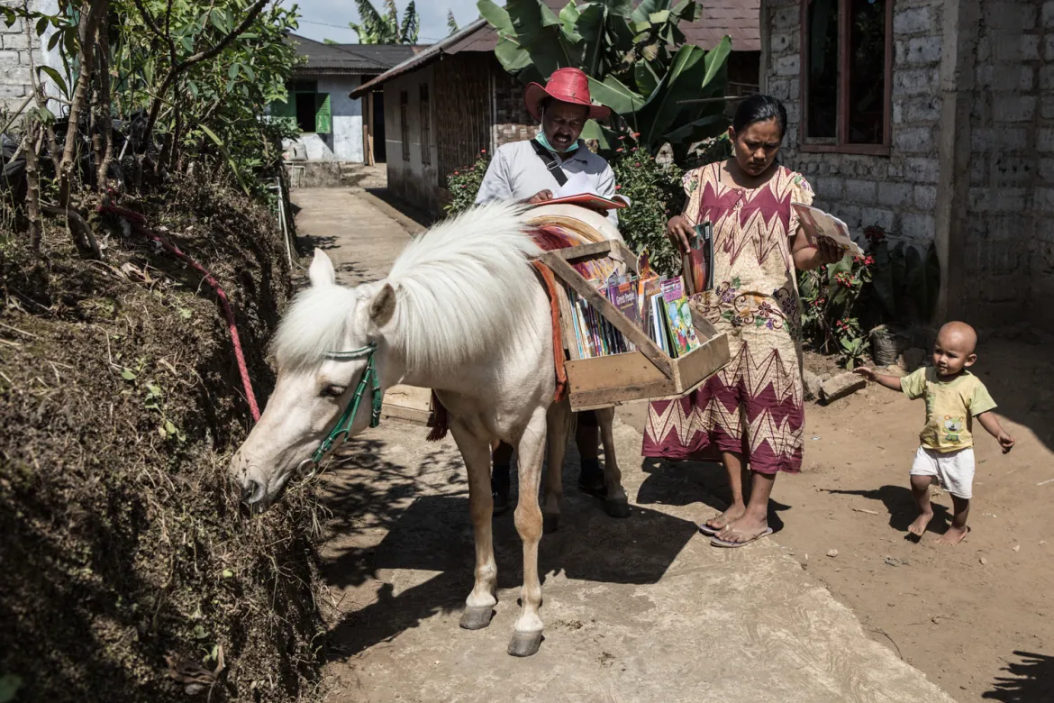 Ridwan is making an effort, a visit at a time, to kids and adults across his village and their neighbors. He’s putting in the hours, getting Luna ready, caring for her, and taking her across the Indonesian landscape to deliver stories, adventures, and the written word to people who would otherwise go without.