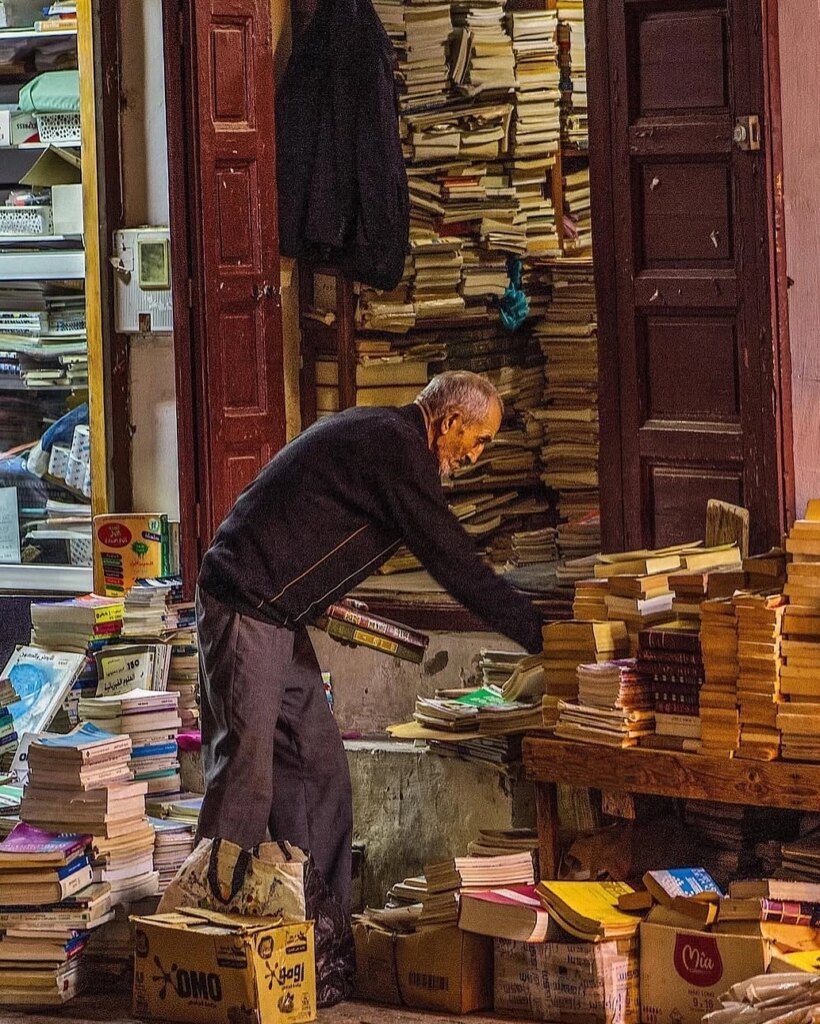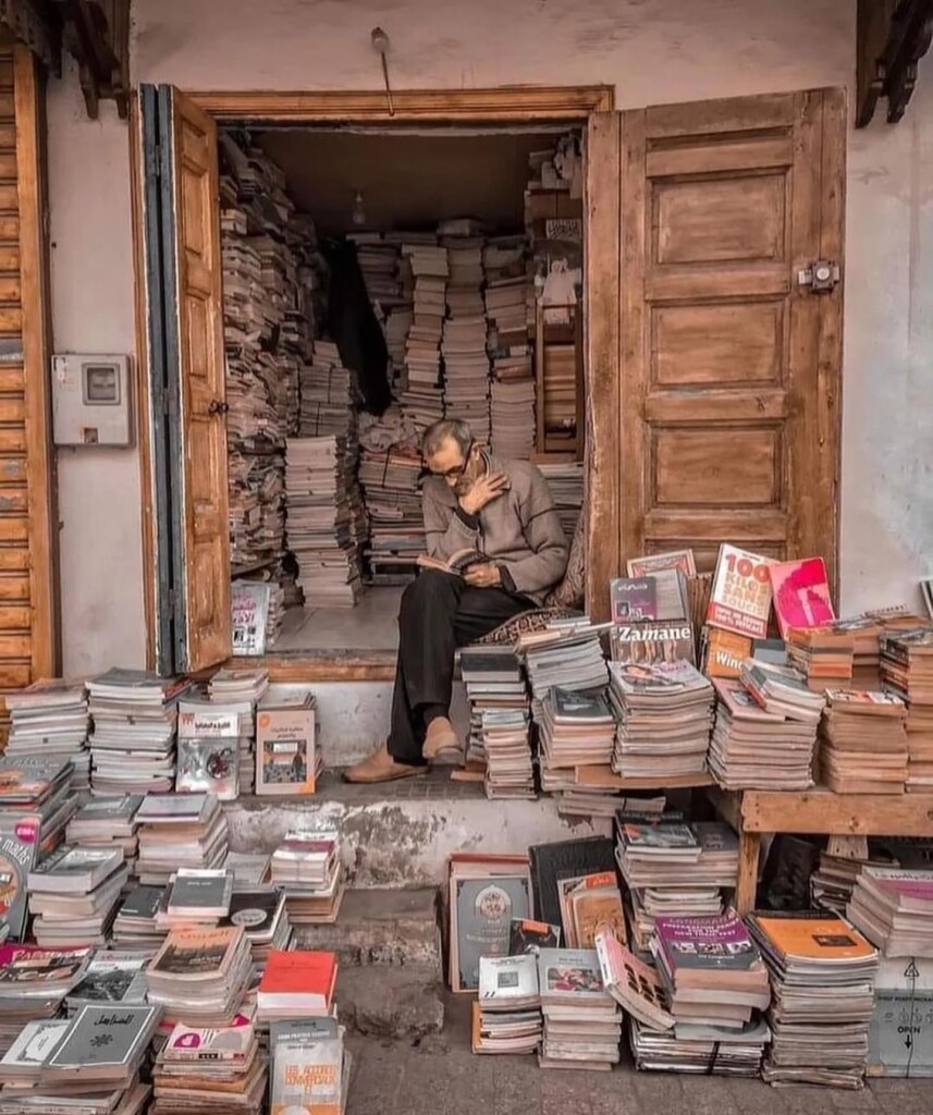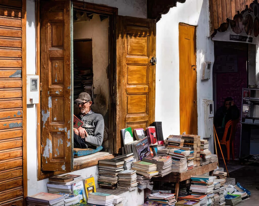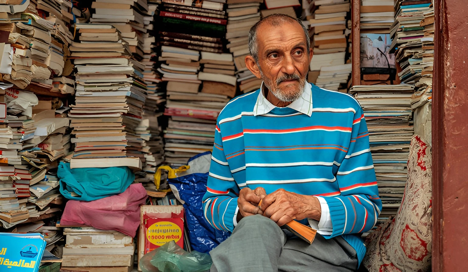 His life reminds us that education isn’t only in classrooms. It inherits texture in street corners, bookstores, and under trees. His shop is like a calm refuge in a bustling medina; you might wander by and see him sitting quietly among stacks of books, reading.