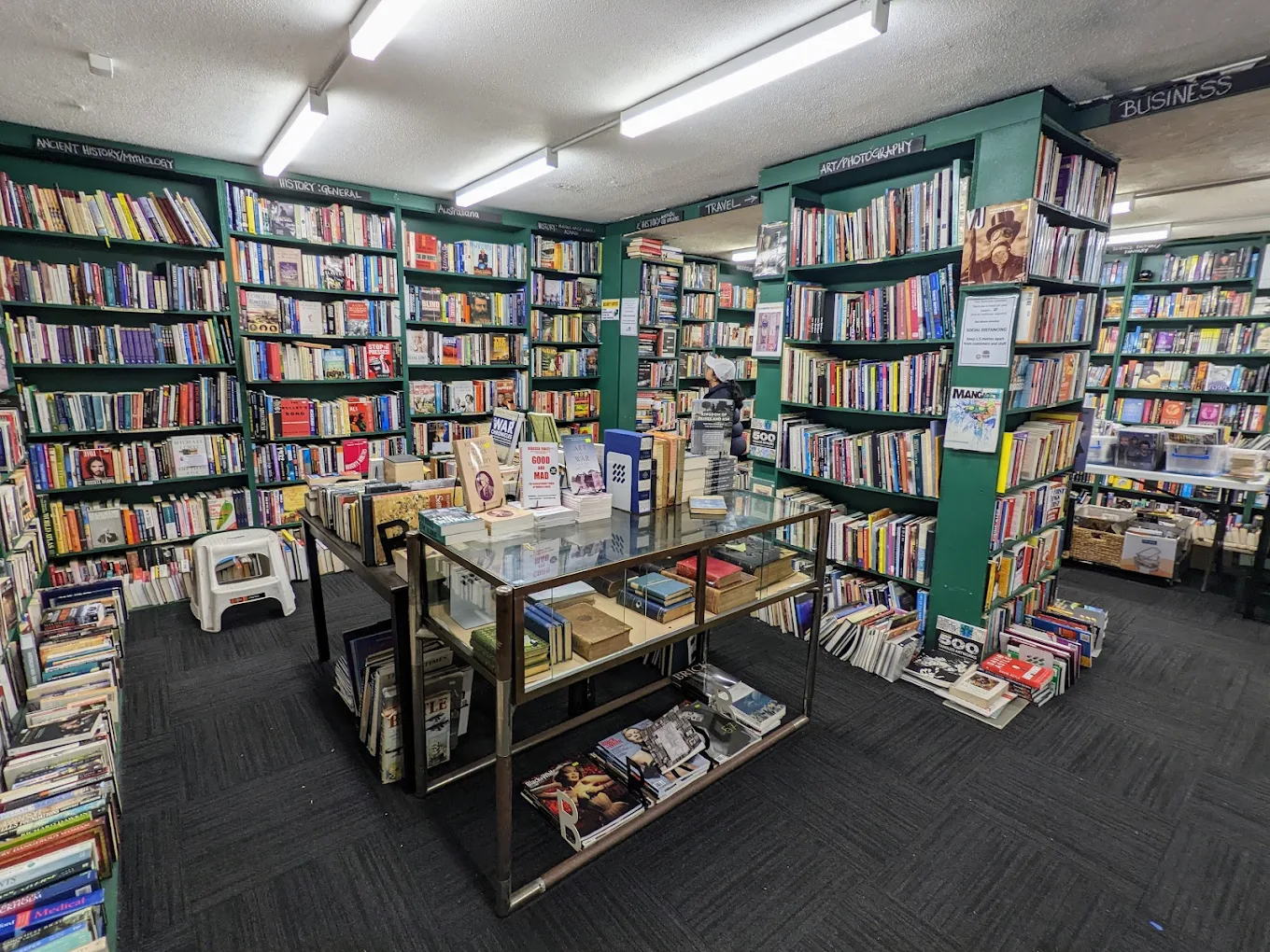 The shop has been around since 1968 and has a clean vibe with blue carpeting, white ceiling tiles, and walls you’ll barely see a glimpse of because there are bookshelves stretching across from corner to corner.