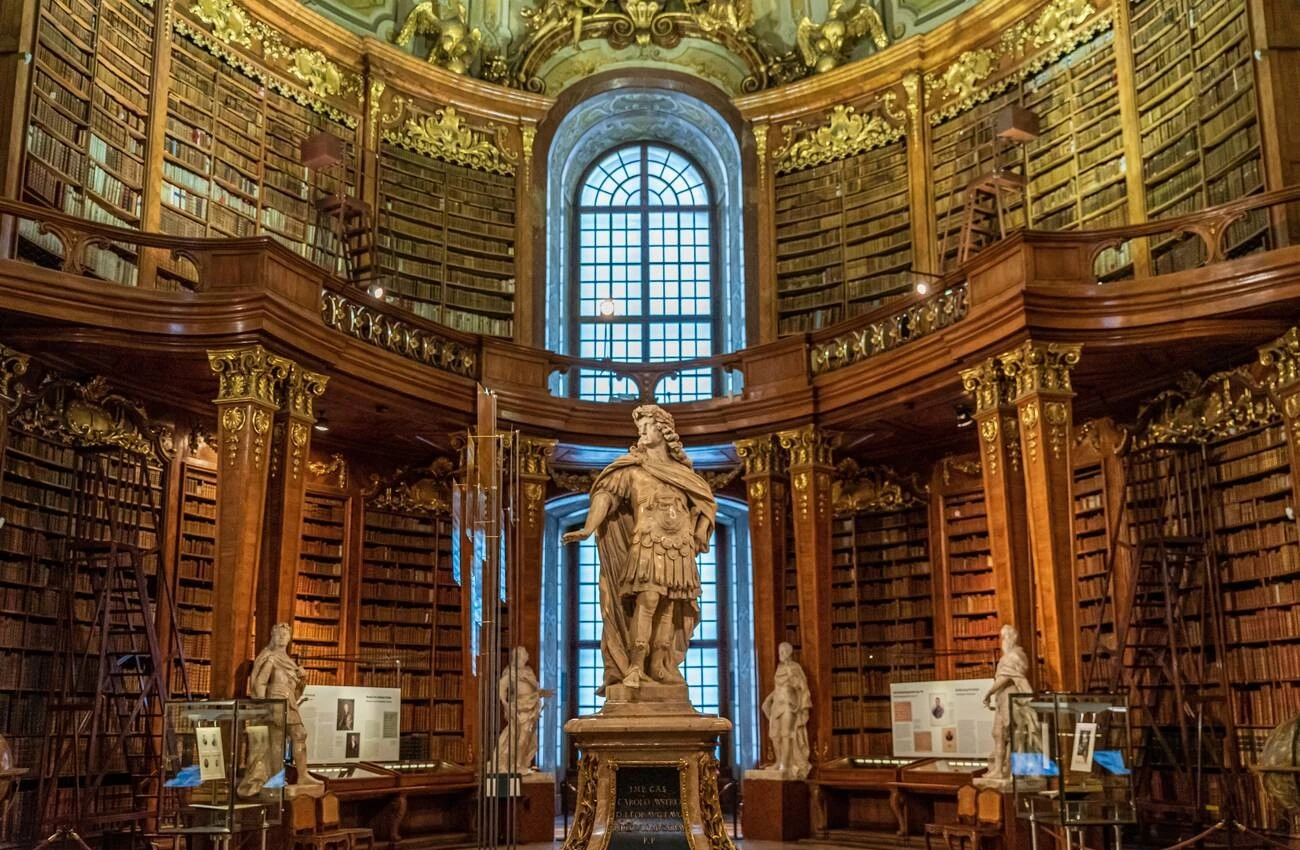 While there’s plenty to see in the Austrian National Library, the biggest draw is its State Hall. This elaborately designed space features a grand oval dome with frescoes depicting Charles VI’s apotheosis, walnut bookcases, marble statues of past rulers, and four massive Venetian globes.