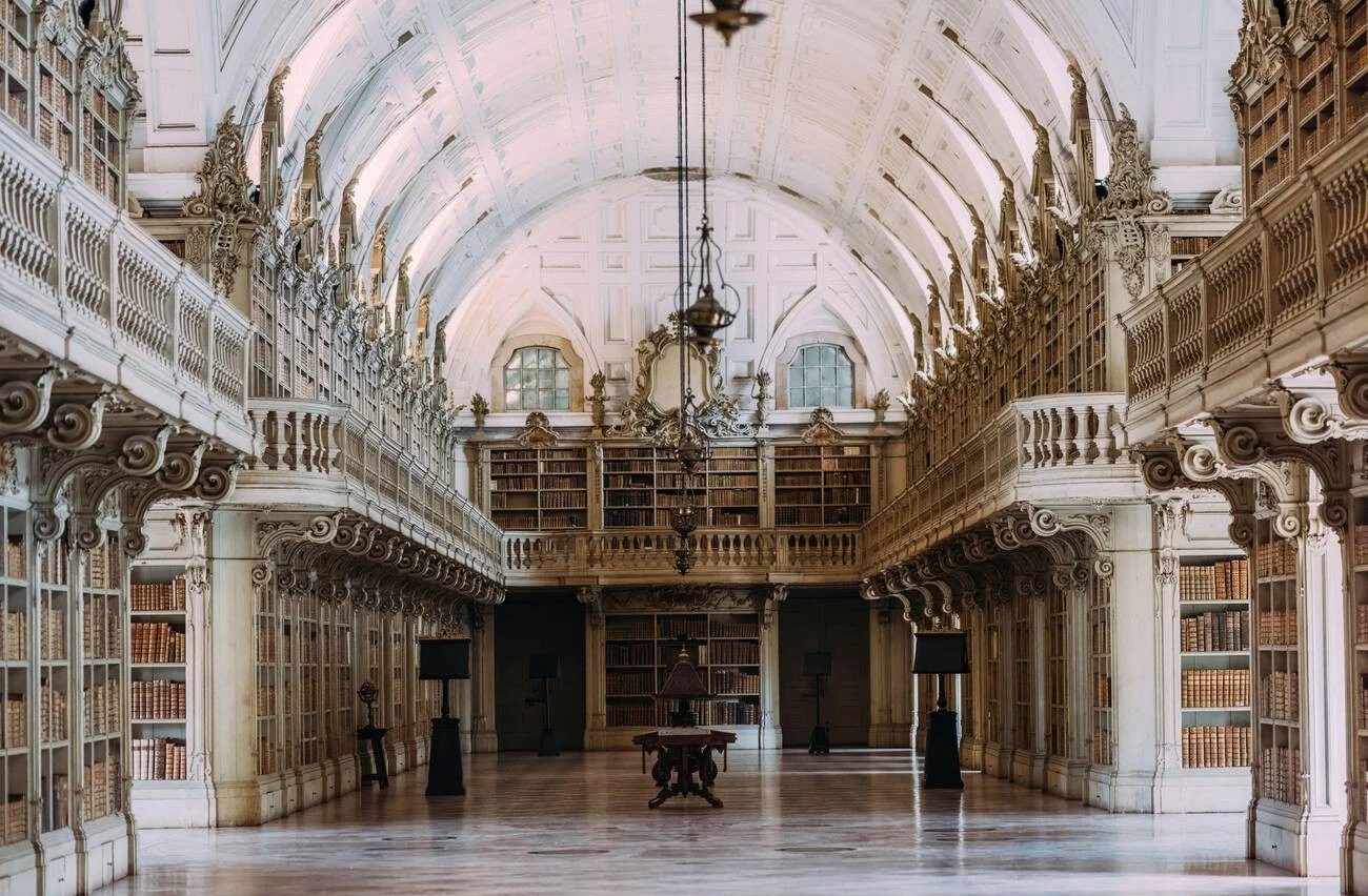 Built in the early 1700s, the Biblioteca Joanina houses 60,000 volumes set on elaborate, gilded oak shelves. It’s three stories tall, and its main reading room stands as a masterpiece of Baroque opulence, complete with marble archways, detailed ceiling frescoes, and a downright regal level of detailing in every banister and pillar.