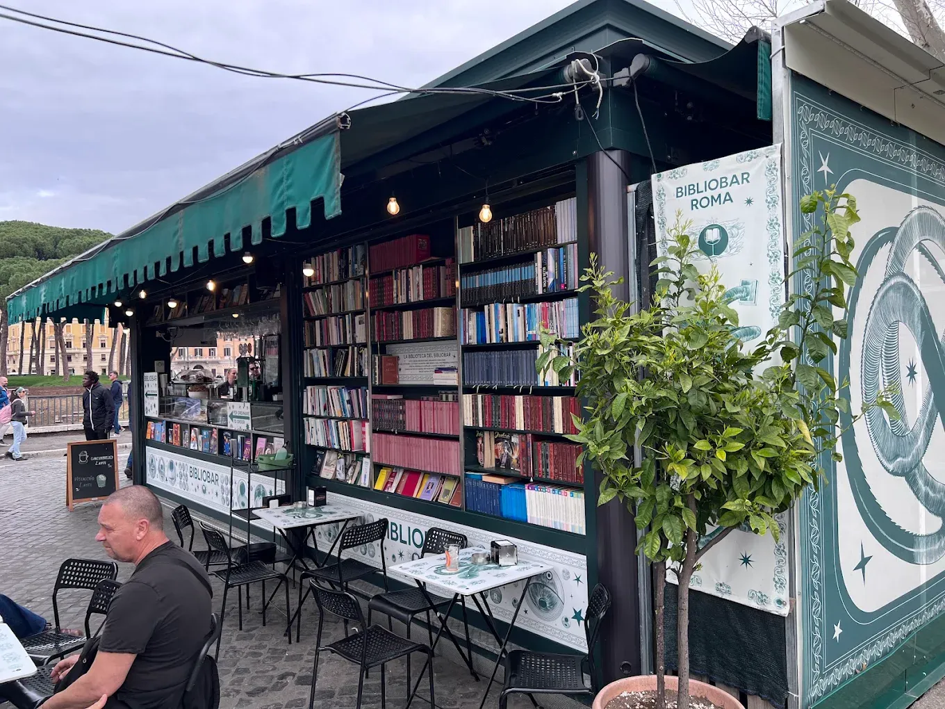 BiblioBar Roma is an outdoor riverside café‑bar just in front of Castel Sant’Angelo. In some ways, it resembles an outdoor food stand since it’s so close to a major walkway and tourist spot, but the proudly displayed bookshelves and covered patio make it clear that it’s quite a bit more than that.