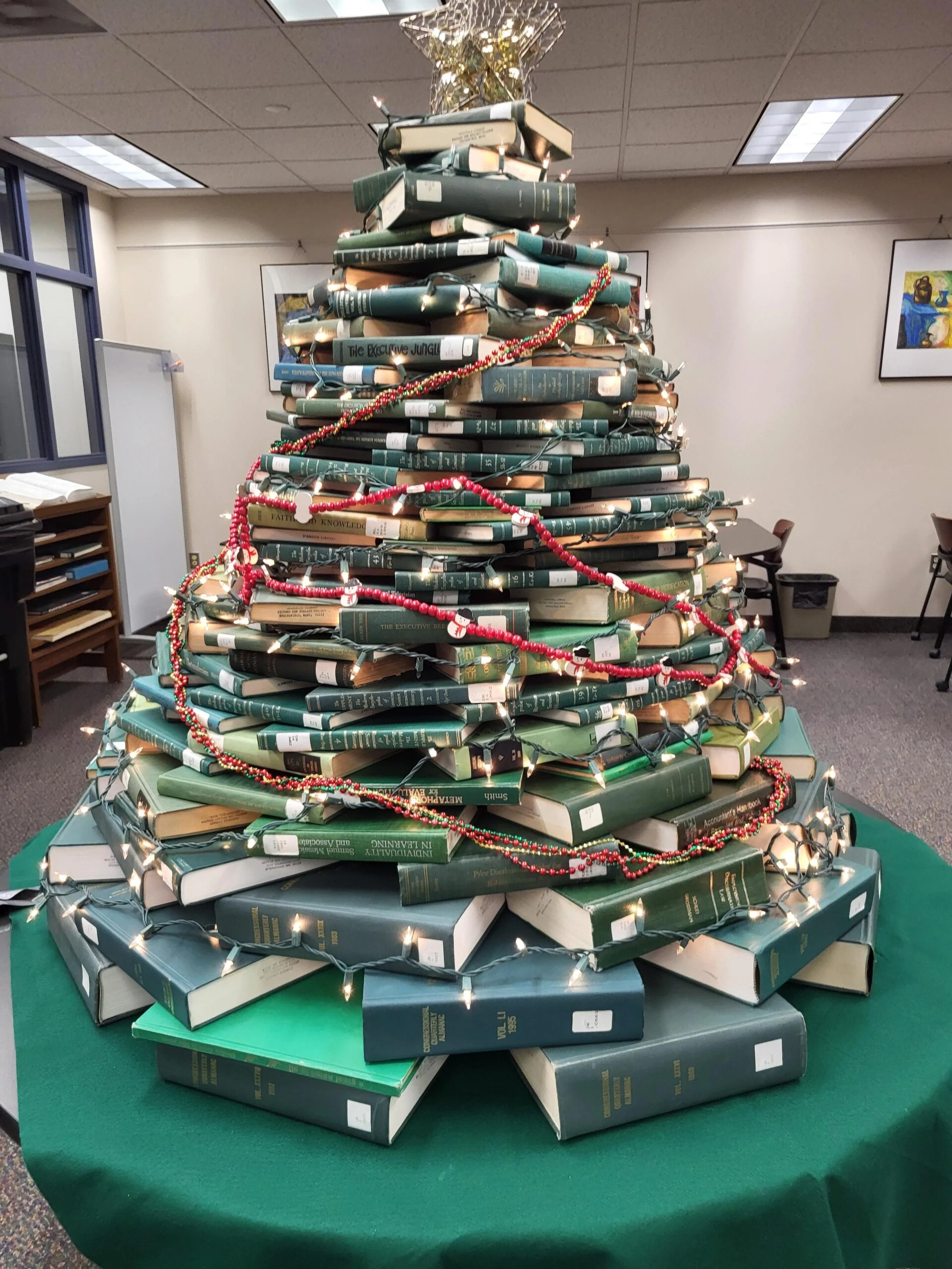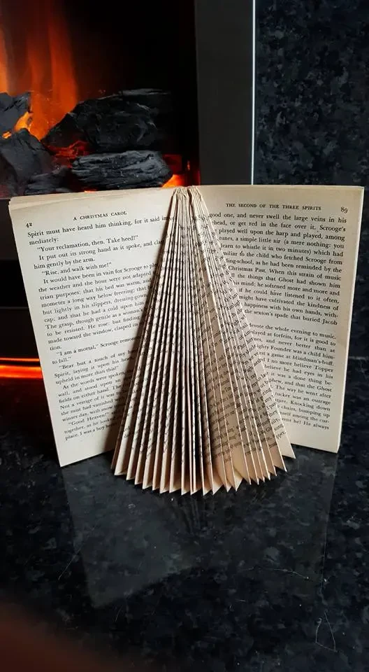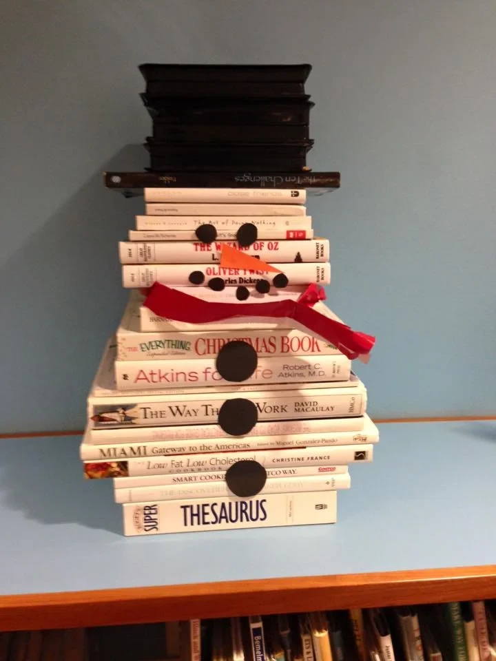 If there are old books that need to be discarded, kids would have fun making Christmas trees out of them. Hundreds of pages per book mean several hundred little trees to adorn the library with. Get some colors on those black and white pages, and there are no better Christmas trees out there.