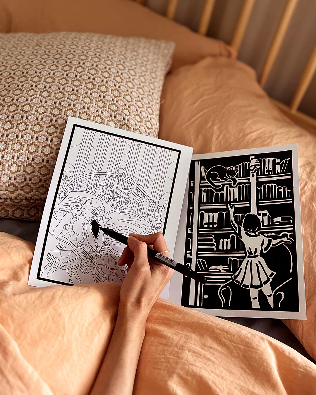 The Bookish Coloring Book includes 50 scenes, ranging from cosy reading nooks, teetering book stacks, library corners, and armchairs you want to climb into with a really good book. Each scene is one designed solely for book lovers looking for a reason to put down their phone and grant themselves a little bit of ma and yukkuri.
