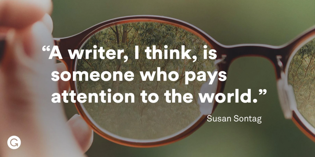 In a speech, Susan Sontag said, “A writer, I think, is someone who pays attention to the world.” Sontag understands, because she lives it herself, that the writer is the observer. The writer notices the little details of a day, the peculiarities of a person, and their habits.